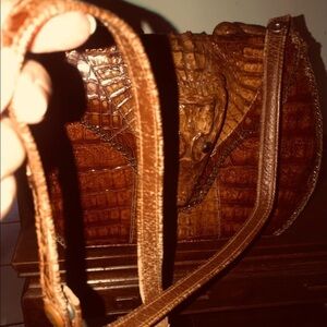 From 1940s Cuba, this shoulder bag is in mint condition. Alligator outside, leather inside. Only imperfections are from wear on end of shoulder strap (photo 9) and