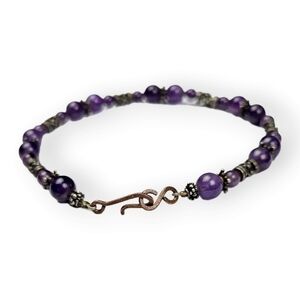 Sleek bracelet with round purple amethyst beads, antiqued silver tone accent beads, and a copper hook clasp