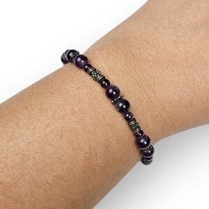 Genuine Amethyst Beaded Bracelet Antiqued Silver Tone Purple Minimalist 7.5"
