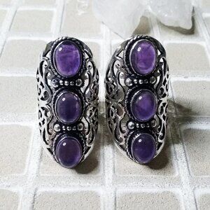 Deeply & rich colored Amethyst Cabochons! While this is a large surface shield ring, this beauty is all feminine essence - with a wide filigree cutout shank. Beautifully contoured to your finger with textured embellishments, solid + sturdy. There is nothing flimsy or cheap about this ring - it is not going to accidentally bend or get shifted out of alignment.