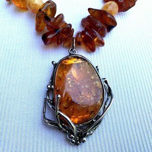 Stunning Genuine Baltic Amber necklace with Silver tone Metal Amber Pendant. Necklace about 20'', size of pendant approx. 2''X1,2''. Total weight 97 grams. Pendant handmade. Nice, fancy addition to your wardrobe! Never been worn.