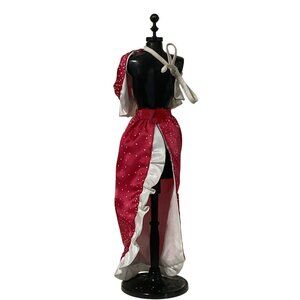 • Features a striking red and white polka dot pattern • Includes elegant ruffled trim • One-shoulder style with a stylish sash • Designed for Barbie dolls • Easy to dress on and off • Mannequin not included