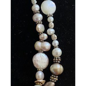 Gorgeous salt water pearl necklace with sterling silver closure. Baroque pearls in white, cream, gray, silver tones, coin pearls, faceted crystal beads in clear, blue and yellow tones. A showcase of different pearls all in one long necklace. Cold to touch. Good preowned condition.