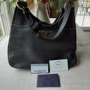 Gently used medium size Prada bag. Snap closure, small zipper compartment on inside. Very small fraying on shoulder straps. No marks!!! Prada cloth bag cover included.