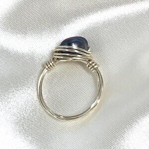 This genuine black pearl ring is crafted from silver tone solid copper wire and a beautiful, iridescent, vintage black pearl with a color range of grey, through blue-purple to deep red purple, reclaimed from a vintage pearl necklace. This beautiful ring is the perfect accessory for lovers of vintage charm and eco-conscious style. Vintage and brand new components. As a vintage piece, this ring may have minor imperfections. Please zoom in on photos for more details.
