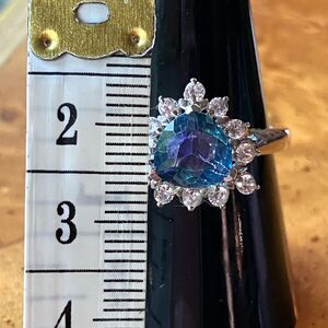 This pretty ring is made with an 8 mm blue mystic topaz stone. The color is beautiful it has blue, green, and purple tones in it. The ring additionally has white zircon accents (zircons are natural, earth mined stones. They are not the same as manmade cubic zirconia). The ring is set in solid .925 sterling silver with a rhodium finish, making it perfect for daily wear. The ring in the photos is the actual one you will receive, so please see photos for quality and measurements. Size 8.
