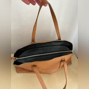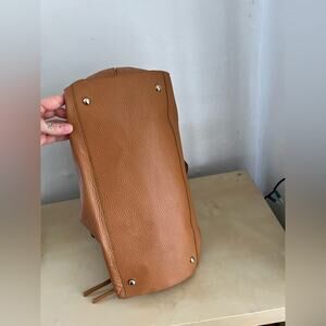 Vintage brown leather bag by clever carriage company. Domed shape with black leather detail at zipper. No crossbody strap, but one can be added as there are the metal clasps for one. Approx 18 inches wide, 9.5 inches tall, with a 5.5 inch handle drop. I am 5’5” for reference and am wearing the bag in the last photo. There is one small faint dot on the exterior. Corners have very minor wear. Handle has a small area of wear at the seam glue. All shown in photos. The leather on this bag is so soft and will only get better with time. Great condition overall.