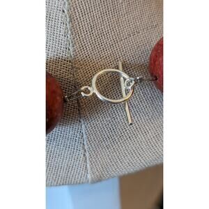 Genuine Coral Marbled Red 20 Bead Statement Necklace w/ Sterling Toggle Clasp. Possibly vintage. Small silver beads separate each of these lovely beads. Strung on silver wire. Approximately 136 grams. The last pictures show what these beads look like under my microscope. Pre-owned, this necklace is in excellent pre-owned condition.