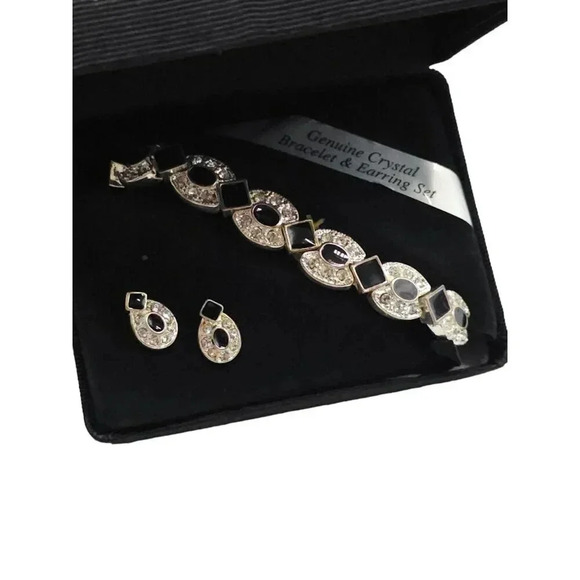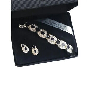 Genuine Crystal Bracelet Earring Set With Black Enamel Clear Rhinestones