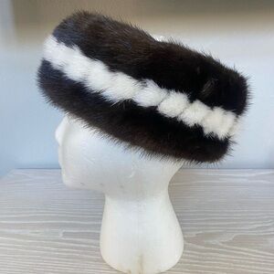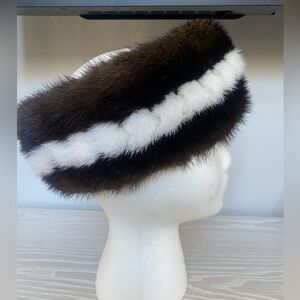 Beautiful and luxurious mink, headwrap or collar. This wrap has dark brown mink with a strip of white mink across the middle. It has a Velcro closure and his lines in Black velvet. So elegant!