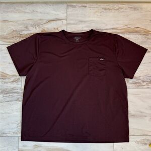 Classic and durable Genuine Dickies short-sleeve t-shirt in a rich maroon color. Features a single chest pocket with Dickies logo tag. Made from 100% polyester for comfort and easy care. Great for casual wear, workwear, or layering.