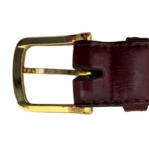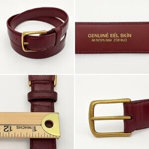 genuine eel skin, burgundy belt, leather belt, gold buckle, vintage belt, classic style, unisex accessory, polished finish, glossy leather, wine red, dress belt, timeless design, retro fashion, elegant look, man-made lining, luxury accessory, statement belt, wardrobe essential, vintage style, sleek design