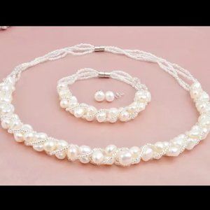 Truly one-of-a-kind, this 17.5" necklace and 8” bracelet features 7mm freshwater pearls that are baroque shaped for added interest and finished with a polished magnetic clasp. The set includes a Sterling Silver pearl earrings.