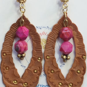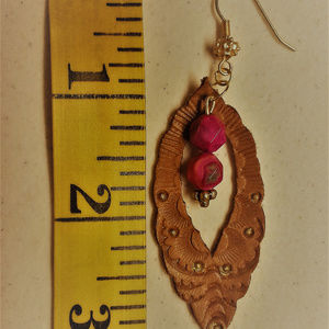 Genuine Handtooled Leather Earrings w/ Ruby Stone