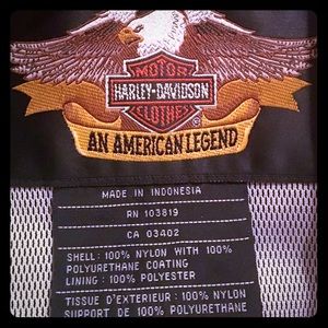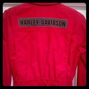 Jacket is red nylon, zippered front and cuffs. Has an elastic drawstring waist. Leather Harley patch on left lapel and cloth Harley patch on the back. Very Nice and only been Worn 2x's. Smoke free home with no indoor pets.