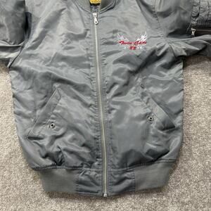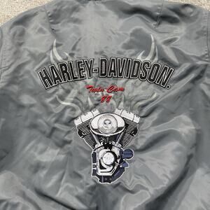 Keywords: Harley Davidson jacket, motorcycle bomber, Twin Cam 88, embroidered Harley coat, nylon bomber jacket, gray riding jacket, Harley Davidson small, vintage style Harley outerwea