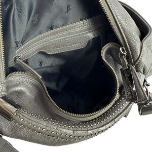 Measurements are 15" wide, 11"5 high, 3" deep with one 36"5 shoulder strap with a 20" drop. This bag is awesome with one main compartment, 2 back pockets, lined in black signature fabric interior with a top detachable shoulder strap. The leather is nice and strong with no tears, very clean both inside and out with dark silver tone hardware and lovely studded top handle. Bag is spacious and comes with one large exterior pocket and hang tag. 100% genuine Kenneth Cole in very good condition and will last you for years to come.