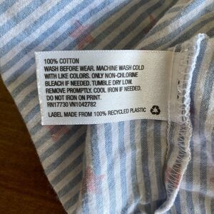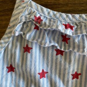 Thin straps with decorative bow detail, double ruffle neckline, fitted bodice with gathering, vertical light blue & white stripes with red star print. Perfect for the 4th of July!