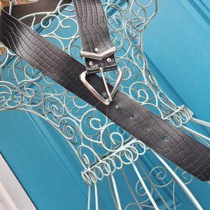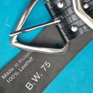 Genuine Leather Belt Alligator Embossed Goth Avant Garde Punk Triangle Silver Metal Belt Buckle Brutalist Medieval Streetwear Belt Womens Unique Belt has a lightweight leather showing only minor signs of use good condition slight sheen tooled to black gator embossing print. Back of belt says 100% Leather B.W. 75 which is possibly how the size is listed in Holland. No flaws has minor bend at 2nd loop hole and both the buckle and leather look good. Pease see below for measurement in inches.