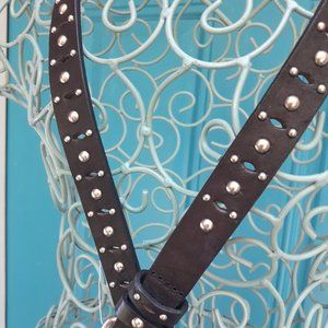 Genuine Leather Belt Metal Studded Silver Studs Grommets Rivets Goth Medieval. Thin black real leather belt with metal studs or almost spikes rounded spikes. Also could be used as jewelry, replacement purse strap, gothic home decor or to accentuate a hat. In good condition. No tag and can see from the back that it is real leather. *Belt has loop holes along entire length of belt so can be clasped at various sizes up to 35 inches at largest. May fit 27, 28, 29, 30, 31, 32, 3, 34 or 35 inch
