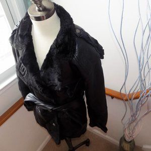 dLinea Genuine Leather Vintage Coat 3/4 Length Fur Trim and Collar Waist Tie Very Warm Lined with Pockets