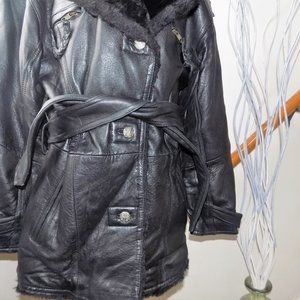 Genuine Leather Black Fur Vintage Coat Women's Size M