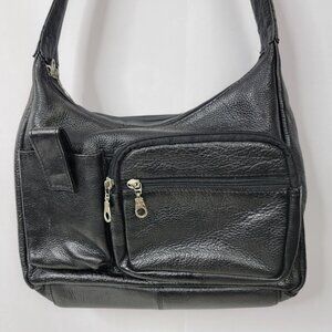 Sleek, durable, and made for busy days—this all-leather shoulder bag is the go-to carryall for those who crave function without sacrificing style. Crafted in supple black genuine leather with a subtly pebbled finish, this bag features: