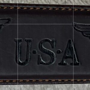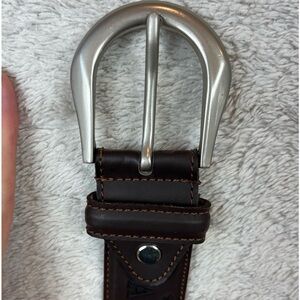 Genuine leather brown belt with silver buckle and repeating USA and embossed American Eagle on the belt in excellent condition.