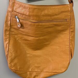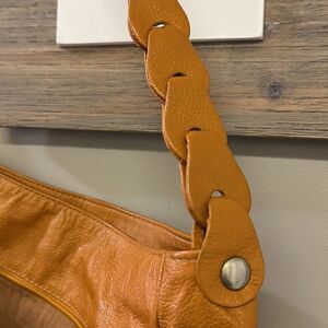 Genuine Leather Camel Shoulder Purse w/ Braided Accent & Silver-Tone Hardware