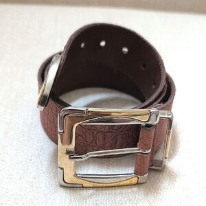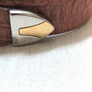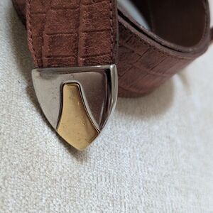 Vintage Genuine Leather Croc Embossed Brown Belt with a gold & silver belt buckle and belt tip. This women's wide leather belt features a large gold and silver tone statement buckle, loop, and belt tip. Soft 100% brown croc leather. Size Medium. Measures approximately: 34" leather belt strap 25.5" to the first hole 30.5" to the last hole 2.5" x 2.5" buckle 1.5" wide Good pre-owned vintage condition. minor discoloration on the belt tip. *see pictures* Bundle items and save 20%!!