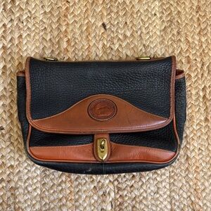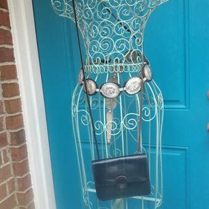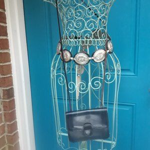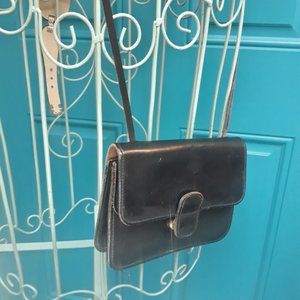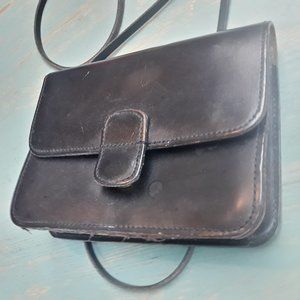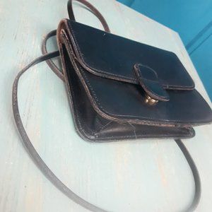 Genuine Leather Crossbody Bag Small with Extra Long Strap Black Rustic Y2K Has 2 pockets inside one is the large main section of bag. Interior is the natural suede back of the leather and has a mark on it and outer leather in good preowned condition.