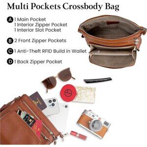 Multi Pockets Shoulder Bag: Front RFID zipper wallet with 6 card slots, 1 inner zipper change pocket and 2 slot pockets; 2 other front zipper pockets; Main zipper pocket with 1 zipper pocket and 1 slot pocket; Extra 1 back zipper pocket. Those pockets providing specific safe space to store your cash, cards, cell phone, ipad mini, sunglasse and your other daily essential