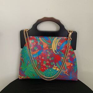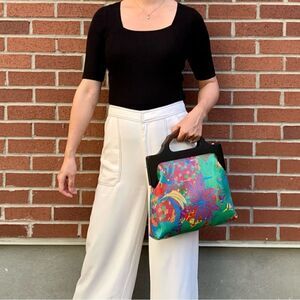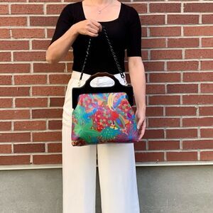 Brand new, only one, very special handmade bag, made from genuine leather, with a wood frame gradient color cut-out handle. Beautiful printed pattern similar but different on both sides, see photos.