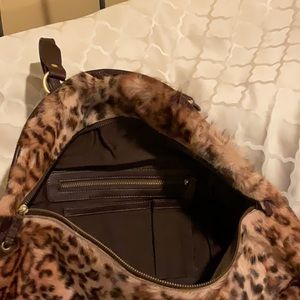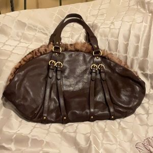 Great Large Soft brown genuine leather with Genuine fur Leopard print with gold hardware. Unique One-of-a-Kind Handbag used in a 90s TV show. Purchased from the studio.