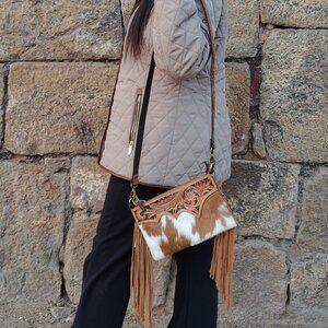 Genuine Leather Hair-on Tooled Bag Women's Western Handbag with Fringes