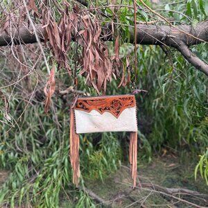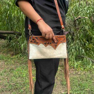 Genuine Leather Hair-on Tooled Bag Women's Western Handbag with Fringes