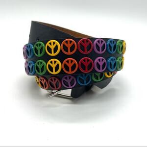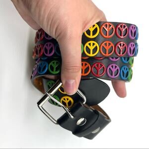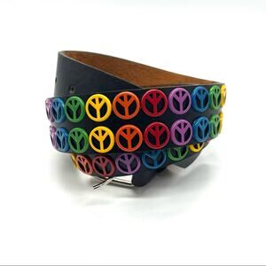 Size M34 - genuine black leather belt with rainbow colored peace metal grommets
