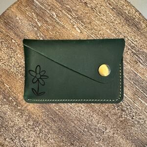 This is a West Hills Studio designed leather wallet credit card holder from our daisy collection with a daisy flower imprinted on the front.