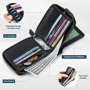 * Large Capacity: The top buckle layer + the zipped pocket + one back card slot. Such structure provides you more room for storage compared with normal bifold wallet. The top buckle layer: 1transparent ID window; 3 card slots; 1 cash pocket. The zipped pocket: 12 card slots; 2 cash pockets; 1 coin zipped pocket. The dimension of this wallet is 4.72”*0.98”*3.54”(Please allow 0.3"-0.9" size error due to manual measurement.) .