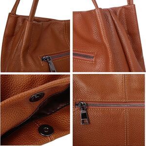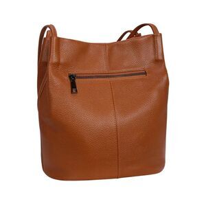 Genuine leather shoulder bag with one large open pocket, 1 smaller compartment, 1 zipper inner pocket, 1 phone pocket and ID card slot and 1 Rear zipper pocket. Size: (L)9.75*(H)11.7*(W)6.24”
