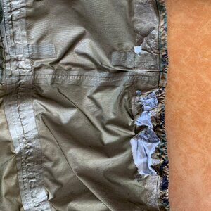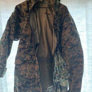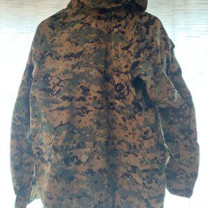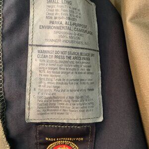 This is a great rain/water/snow proof jacket! Size "Small, Long". Wear it to protect yourself from the elements, and your enemies! This is a remnant of gear that I acquired while in the Marine Corps, and it is exactly what you would expect. Unfortunately some well intentioned, but dim-witted jarhead tried to put this article through the washer and dryer, and melted a bit of the seam protection at the bottom of the jacket (see last pic). This should not impact the performance of the jacket, and the price reflects the worn nature of the piece. Enjoy!