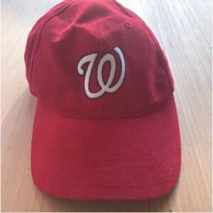 A1 Hat/Cap Genuine MLB Merchandise by T.E.I. Made in Bangladesh Adult Adjustable Hook & Loop Strap Washington Nationals logo & type in BW on face /Red Hat with grey underbill red white 100 % Cotton