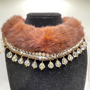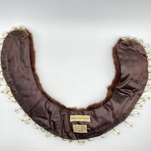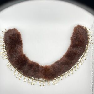 Genuine mink hand made by Top Hit Fashion Baare Beards, Inc. Japan collar. Genuine chocolate brown mink is embellished with a row of faux pearls, a row of rhinestones and the edge features dangling pear shape faceted glass drops. The rhinestones are prong set. Satin back. It is about 14" long and has a hook closure. Vintage. Pre-owned. Very good condition. Luxurious and classy.