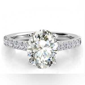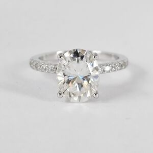 Genuine GRA certified 3 carat moissanite ring with a sparkling prong set moissanite with tiny accents along the sides. The setting was crafted of solid sterling silver with 18kt white gold overlay. Stamped 925