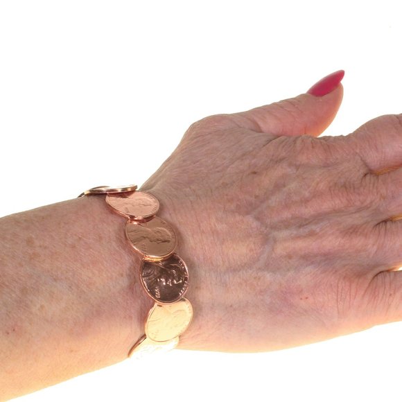 Real Copper Penny Bracelets in 5 sizes. Welded pre '82 pennies. Can be bent to fit around your wrist. You will never be penniless! (Yes it's legal!)