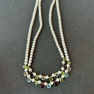 New in box never worn genuine pearls and gemstone necklace. Unique and different I never seen another one like it is beautiful. This is a two strand necklace choker type 10” long. The clasp is 10K gold, gemstones are peridot, aquamarine, citrine and garnet. I purchased these at JCPENNEY several years ago but never used them. Pearls never go out of style would make a great Mother’s Day gift.