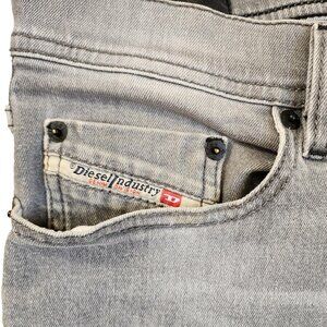 These genuine Slim-fit Diesel Jeans are in very good condition. Button Fly. Grey. The tag states Waist: 31 and Length: 32. Measurements show the waist to be closer to 32 - 33". And the inseam measures 31 1/2". The calf area measures approx. 14". 6RJYJU - 1 Model is A.I. generated for an example of fit.