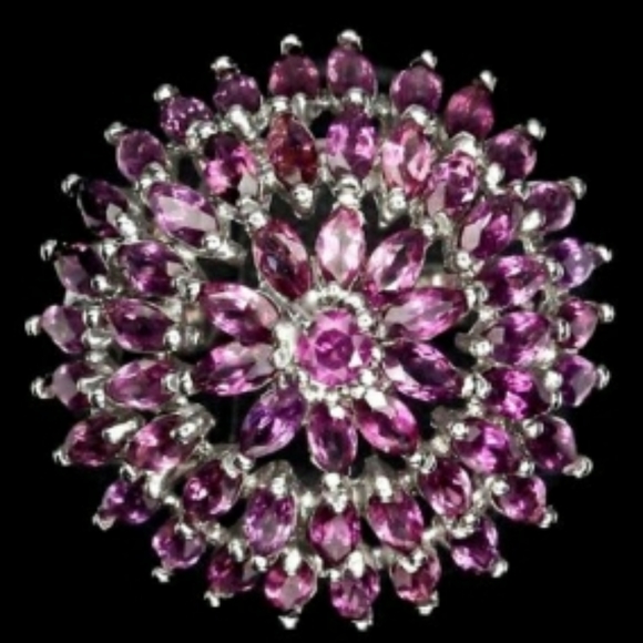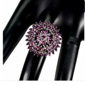 Gracious, a true showstopper one of a kind see it from across the room statement ring! Here are multi rows of raspberry color garnets of a sunburst design in sterling silver. Ladies, the face of this stunner is BIG!! Sz 8
