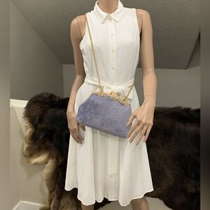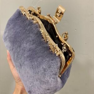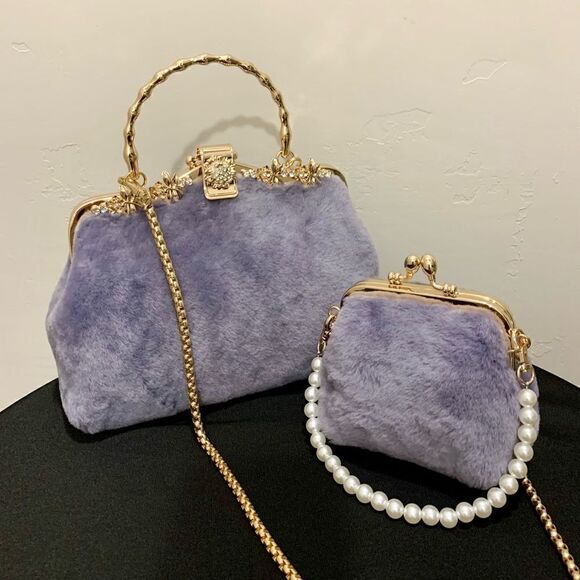 Handmade from dyed genuine shearling leather with metal frame, Includes a small clutch. Use in multiple ways, can be hand carried or with chains, use together or separately. The larger one can hold a lot, spacious enough