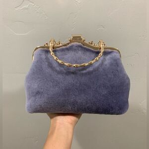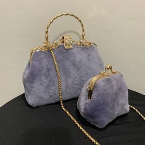 Genuine Shearling Leather Handmade Top Handle Metal Frame Bag & Small Clutch Set